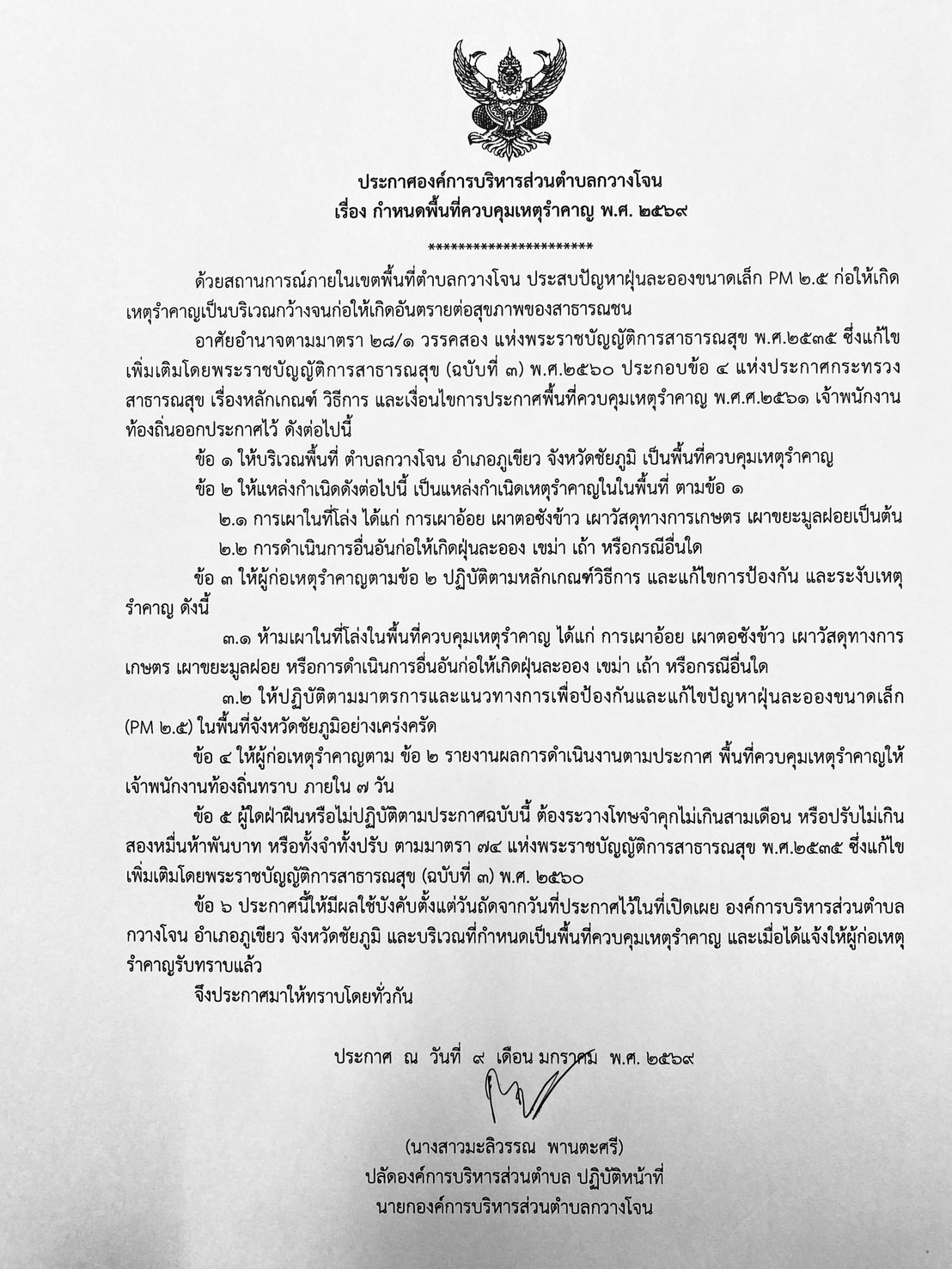 ประกาศองค์การบริหารส่วนตำบลกวางโจน เรื่อง กำหนดพื้นที่ควบคุมเหตุรำคาญ พ.ศ.2569
