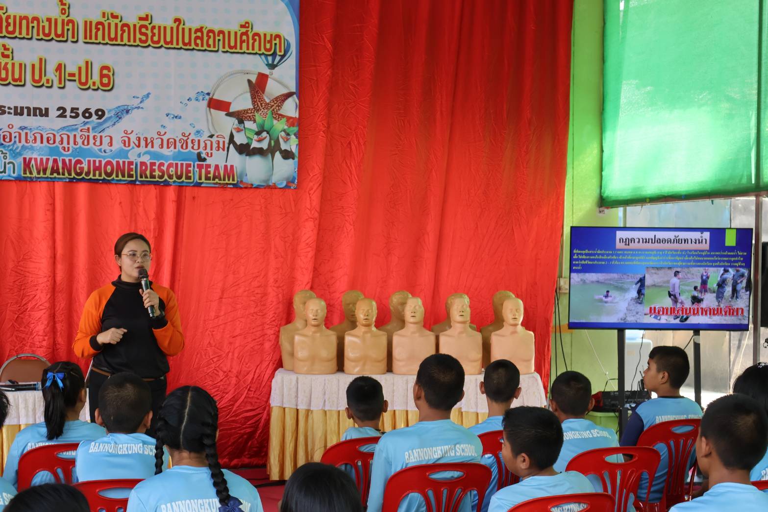 งานป้องกันและบรรเทาสาธารณภัย องค์การบริหารส่วนตำบลกวางโจน ได้จัดฝึกอบรมโครงการสร้างความปลอดภัยทางน้ำ แก่นักเรียนในสถานศึกษา ระดับชั้นประถมศึกษาปีที่ 1-6 พื้นที่ตำบลกวางโจน ประจำปีงบประมาณ 2569 ณ อาคารงานป้องกันและบรรเทาสาธารณภัย องค์การบริหารส่วนตำบลกวางโจน อำเภอภูเขียว จังหวัดชัยภูมิ โดยมีนายจักรพันธ์ เหล่ามะลึก นายกองค์การบริหารส่วนตำบลกวางโจน เป็นประธานในพิธีเปิดการฝึกอบรม พร้อมด้วยนายชนินทร์ บุตะเขียว เลขานุการนายกองค์การบริหารส่วนตำบลกวางโจน ,นางสาวมะลิวรรณ พานตะศรี ปลัดองค์การบริหารส่วนตำบลกวางโจน หัวหน้าส่วนราชการ พนักงานเจ้าหน้าที่ วิทยากร ครูฝึก องค์การบริหารส่วนตำบลกวางโจน การฝึกอบรมในครั้งนี้นางสาวรัตนพร เหล่าคนกล้า ผู้อำนวยการโรงเรียนบ้านหนองกุง พร้อมคณะครู นำนักเรียนโรงเรียนบ้านหนองกุง ชั้นประถมศึกษาปีที่ 1-6 เข้าร่วมฝึกอบรมให้ความรู้เกี่ยวกับ เรื่องของหลักความปลอดภัยทางน้ำ ฝึกปฏิบัติการเอาชีวิตรอดในน้ำ ฝึกปฏิบัติการช่วยเหลือผู้ประสบภัยทางน้ำ ฝึกปฏิบัติการช่วยฟื้นคืนชีพ (CPR) ภัยอันตรายจากการเล่นน้ำ โดยมีครูฝึก/วิทยากร จากผู้นำฝ่ายปกครอง กำนัน ผู้ใหญ่บ้าน อาสาสมัครป้องกันภัยฝ่ายพลเรือน อาสาสมัครสาธารณสุขประจำหมู่บ้าน และเครือข่ายเฝ้าระวังป้องกันการจมน้ำตำบลกวางโจน