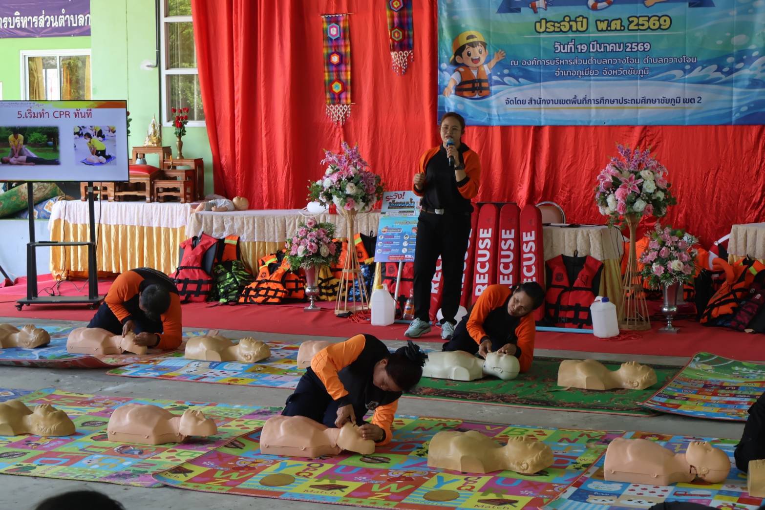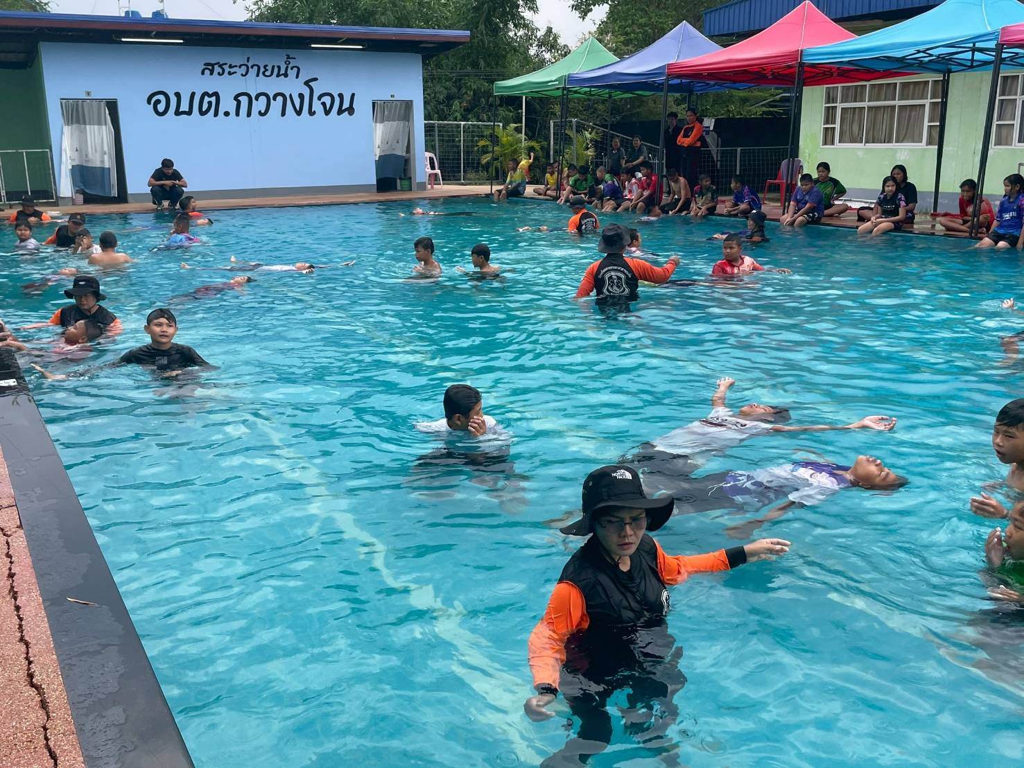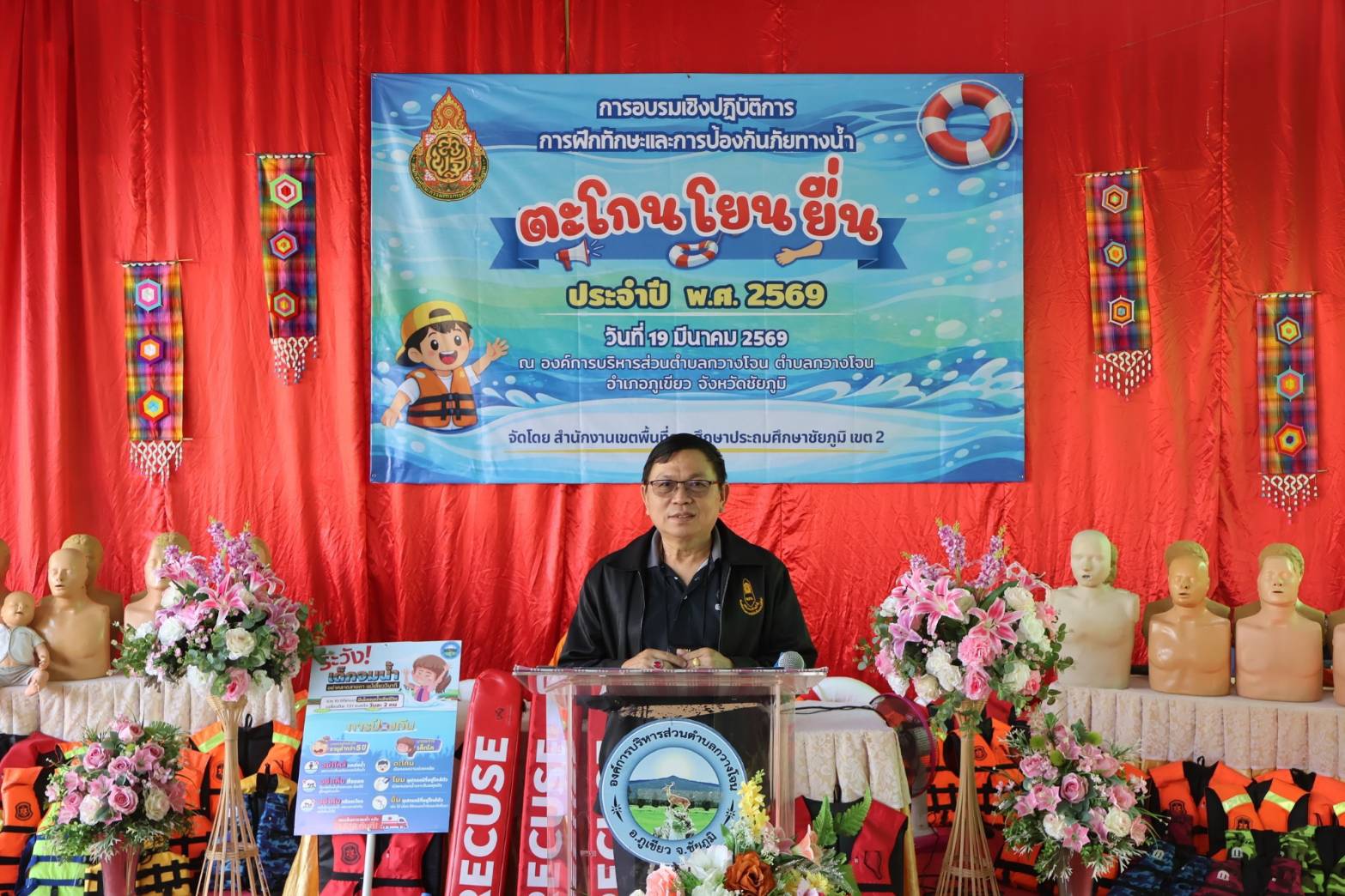 ศูนย์ฝึกอบรมการป้องกันเด็กจมน้ำ องค์การบริหารส่วนตำบลกวางโจน กวางโจนเพนกวิน ส่งเสริมความปลอดภัย เด็กไทยไม่จมน้ำ โดยการนำของ นายจักรพันธ์ เหล่ามะลึก นายกองค์การบริหารส่วนตำบลกวางโจน และนางสาวมะลิวรรณ พานตะศรี ปลัดองค์การบริหารส่วนตำบลกวางโจน ได้จัดทีมวิทยากรให้ความรู้เกี่ยวกับการป้องกันเด็กจมน้ำ ณ ศูนย์ฝึกป้องกันเด็กจมน้ำ องค์การบริหารส่วนตำบลกวางโจน ซึ่งทางสำนักงานเขตพื้นที่การศึกษาประถมศึกษาชัยภูมิ เขต 2 ได้จัดโครงการอบรมเชิงปฏิบัติการฝึกทักษะชีวิตและการป้องกันภัยทางน้ำ ภายใต้หลัก “ตะโกน โยน ยื่น” ประจำปี 2569 ซึ่งมีนายอภิชัย ซาซุม ผู้อำนวยการสำนักงานเขตพื้นที่การศึกษาประถมศึกษาชัยภูมิ เขต 2 เป็นประธานในพิธีเปิดโครงการฝึกอบรม พร้อมด้วยหัวหน้าส่วนราชการของสำนักงานเขตพื้นที่การศึกษาประถมศึกษาชัยภูมิ เขต 2 โดยนายจักรพันธ์ เหล่ามะลึก นายกองค์การบริหารส่วนตำบลกวางโจน พร้อมด้วยคณะผู้บริหาร หัวหน้าส่วนราชการพนักงานเจ้าหน้าที่ ขององค์การบริหารส่วนตำบลกวางโจน ร่วมให้การต้อนรับในการฝึกอบรม ทำการฝึกอบรมให้ความรู้ให้นักเรียน ทั้งหมด 16 โรงเรียน ในสังกัดสำนักงานเขตพื้นที่การศึกษาประถมศึกษาชัยภูมิ เขต 2 จำนวน 96 คน ในเรื่องของหลักความปลอดภัยทางน้ำ ฝึกปฏิบัติการเอาชีวิตรอดในน้ำ ฝึกปฏิบัติการช่วยเหลือผู้ประสบภัยทางน้ำ ฝึกปฏิบัติการช่วยฟื้นคืนชีพ (CPR) โดยทีมครูฝึก/วิทยากร จากเครือข่ายป้องกันการจมน้ำตำบลกวางโจน