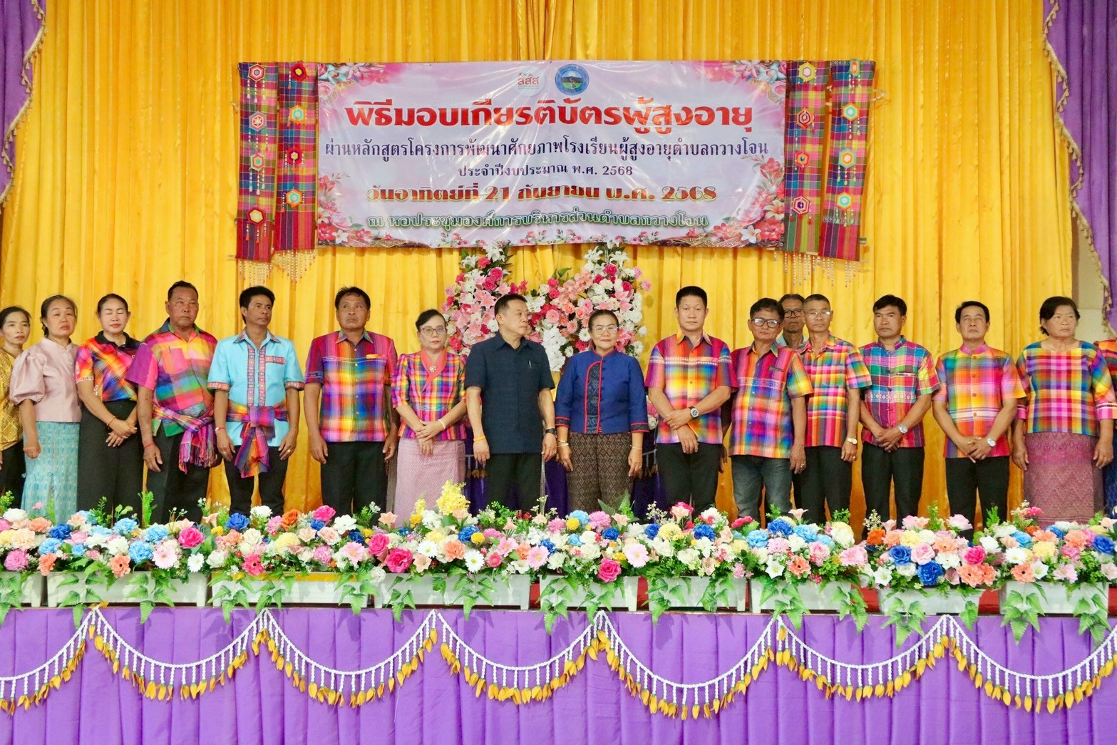 องค์การบริหารส่วนตำบลกวางโจน นำโดยนางพูมใจ ประทุมคำ นายกองค์การบริหารส่วนตำบลกวางโจน พร้อมด้วยคณะผู้บริหาร นางสาวมลิวรรณ พานตะศรี ปลัดองค์การบริหารส่วนตำบลกวางโจน พร้อมด้วยคณะ ได้ดำเนินกิจกรรมมอบเกียรติบัตรให้แก่ผู้สูงอายุตามโครงการพัฒนาศักยภาพนักเรียนผู้สูงอายุ ประจำปี 2568 โดยได้รับเกียรติจากท่าน เชวงศักดิ์ เร่งไพบูลย์วงษ์ สมาชิกสภาผู้แทนราษฎรจังหวัดชัยภูมิ เขต 6 ให้เกียรติเป็นประธานในพิธีมอบเกียรติบัตรและปิดกิจกรรมโครงการ พร้อมด้วยท่าน ศิริพรรณ บุตะเขียว สมาชิกสภา อบจ.ชัยภูมิ เขต 4 และผู้นำท้องถิ่น ท้องที่ หัวหน้าส่วนราชการในตำบลกวางโจน ร่วมเป็นเกียรติในกิจกรรมครั้งนี้ โดยมีผู้สูงอายุเข้ารับมอบเกียติบัตรจำนวน 200 ท่าน